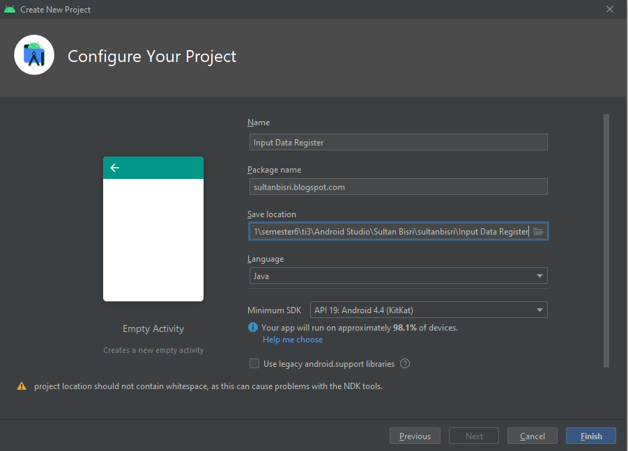 bahasa “Java” dengan minimum APInya adalah API 19, terakhir kil tombol finish.