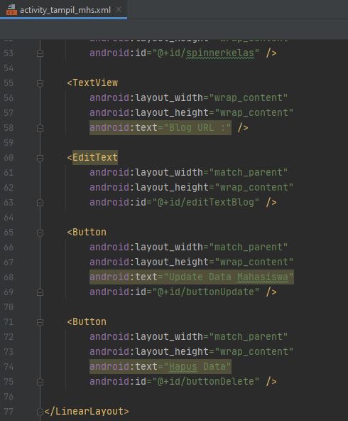 1. activity_tampil_semua_mhs.xml Layout ini nantinya akan digunakan untuk melihat semua data mahasiswa yang sudah diinputkan pada layout utama. Silahkan tambahkan kode-kode dibawah pada layout tersebut :